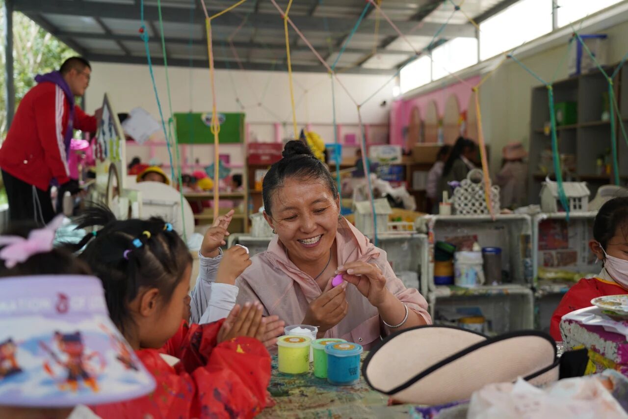 图为幼儿正在与老师进行户外手工活动。记者 洛桑旦增 永青 摄