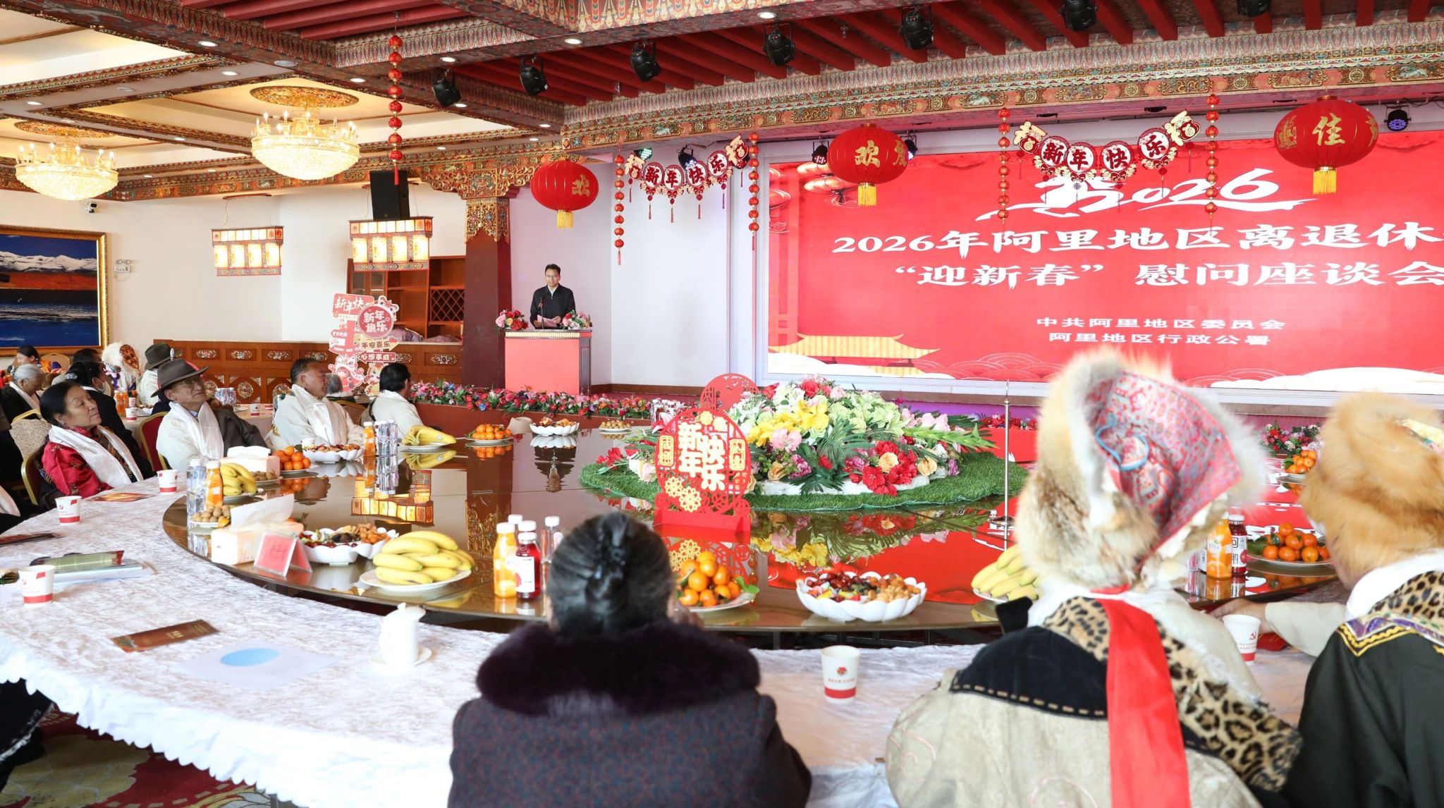 在春节、藏历新年来临之际,2月9日,阿里地区召开离退休干部“迎新春”座谈会。地委书记索南丹增出席并致辞,地委副书记、政法委书记李斌,人大地工委副主任辜建忠,地区政协副主席王海龙、次仁杰阿等地区领导,与近百名老干部欢聚一堂,喜迎佳节,互致祝福,共话发展。地委委员、组织部部长何界主持,行署副专员、公安处处长德庆次仁通报2025年阿里地区经济社会发展情况。