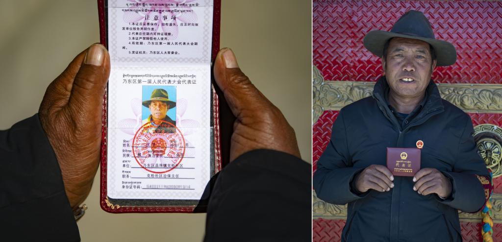 次罗在展示他的人大代表证(拼版照片,3月24日摄)。