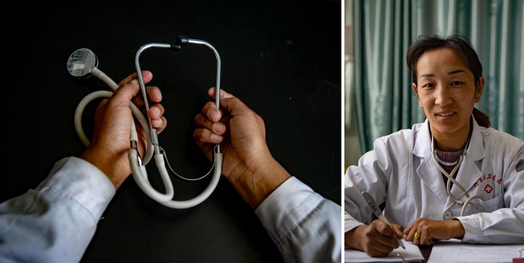 左图:村医白玛措姆展示她的听诊器;右图:村医白玛措姆在工作(拼版照片,3月12日摄)。