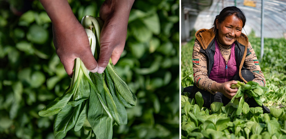 白玛央宗在自家承包的蔬菜大棚里采摘蔬菜(拼版照片,3月12日摄)。