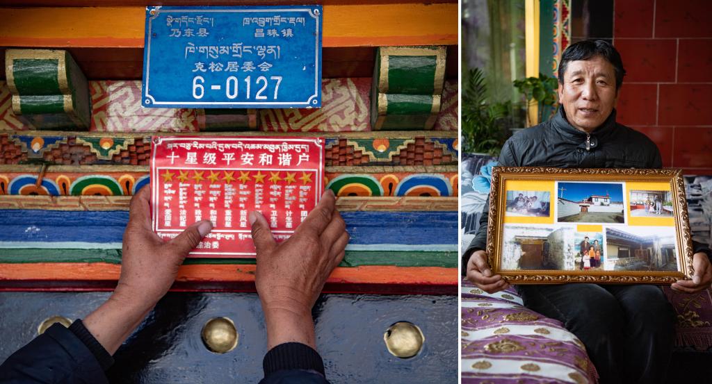 达瓦展示他的“四代”藏式房(拼版照片,3月12日摄)。
