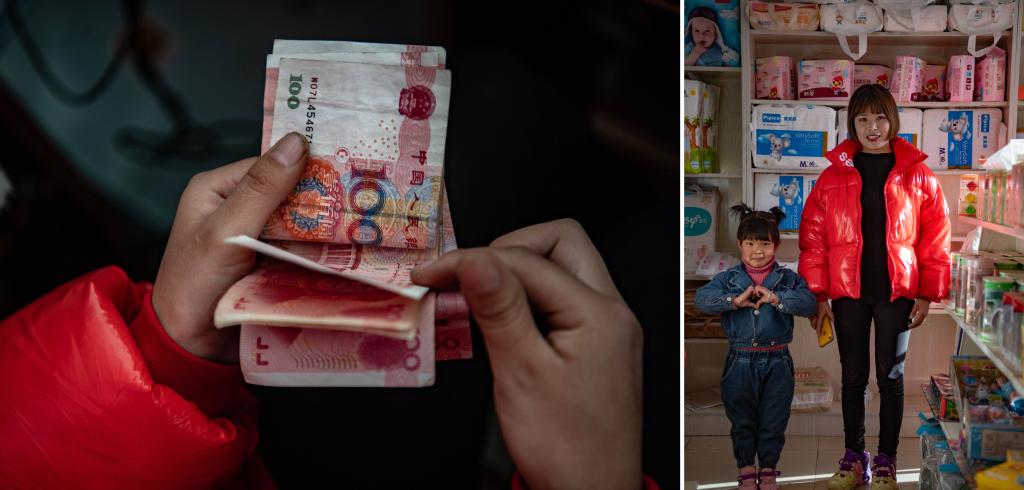 左图:卓玛央金在清点自家超市收入的现金;右图:卓玛央金和女儿在自家超市里合影(拼版照片,3月12日摄)。