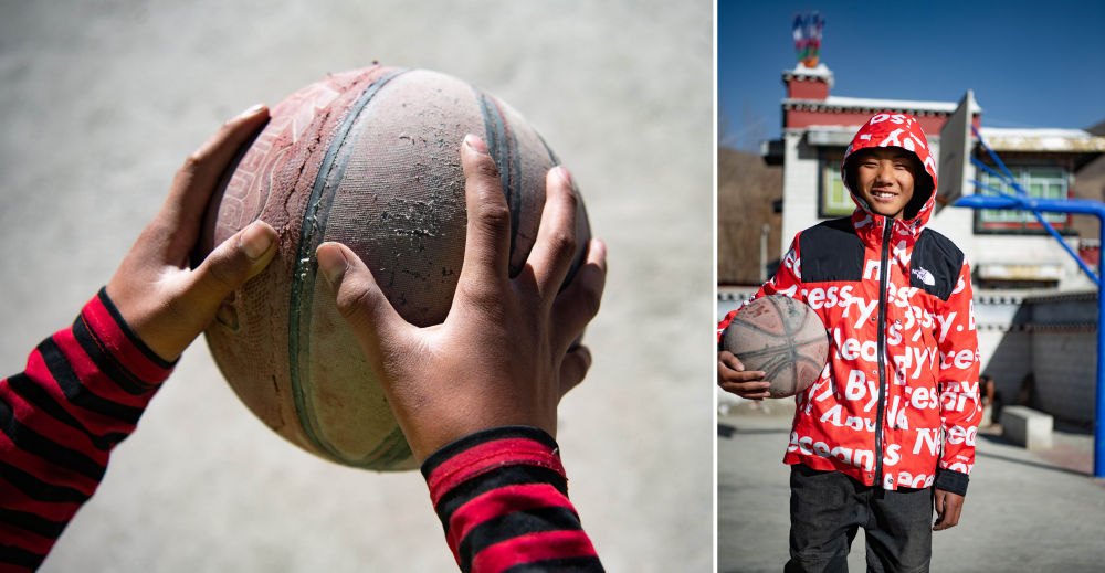 西藏山南市克松社区的云丹在打篮球(拼版照片,3月12日摄)。