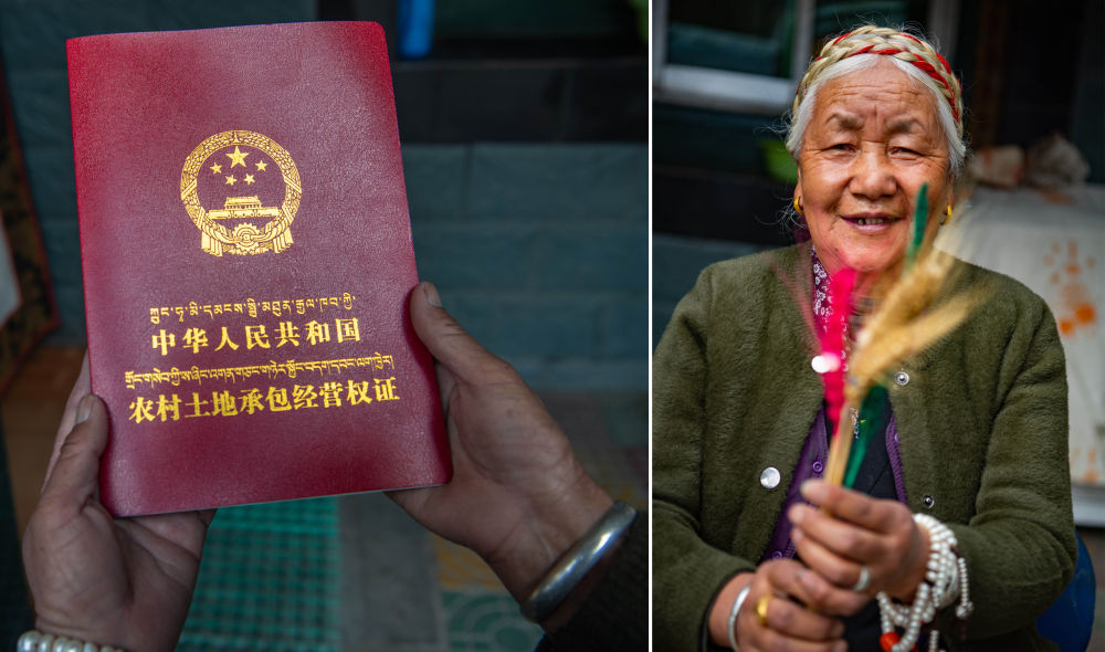 左图:巴杰展示自家农村土地承包经营权证;右图:巴杰在家中展示五彩青稞(拼版照片,3月13日摄)。