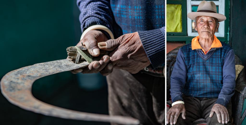 左图:扎西双手拿着旧西藏时自己使用过的镰刀;右图:扎西在自己家中(拼版照片,3月12日摄)。