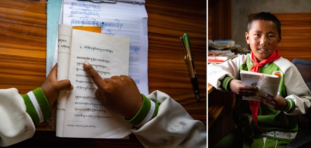 白玛罗布在家中学习(拼版照片,3月12日摄)。