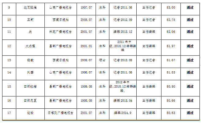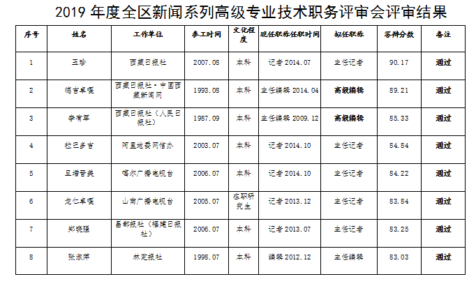 2020年5月26日,西藏自治区新闻专业职务高级评审委员会组织召开了2019年度自治区新闻系列高级专业技术职务评审工作会议。经过近5个小时的评审,18名评委最终投票打分,评审会一致认为德吉卓嘎等3人具备新闻系列正高专业技术职务任职资格,玉珍等16人具备新闻系列副高专业技术职务任职资格。按照淘汰率10%的要求,最终淘汰分数排名最后的肖圆园、索朗卓嘎 2人。