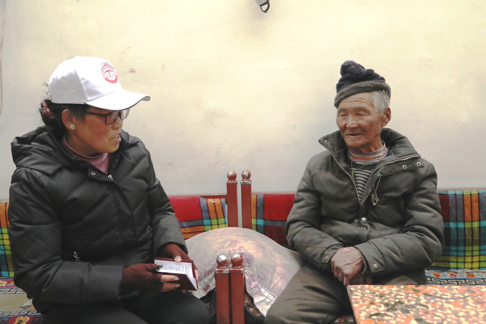 图为拉郊村村委会主任扎西桑珠(左)在向原建档立卡贫困户加央拉姆宣讲党的惠民政策。记者 段敏 摄