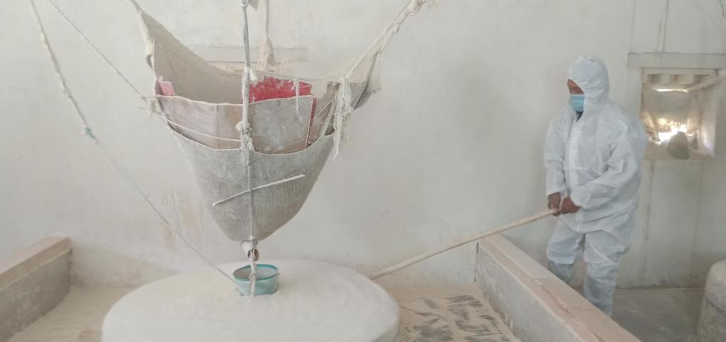 图为工作人员往磨堂内添青稞。西藏日报记者 杨光远 摄