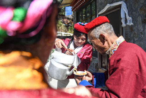 山南市错那县勒门巴民族乡贤村的门巴族居民庆祝乔迁新居(2019年9月26日摄)。新华社记者 晋美多吉 摄