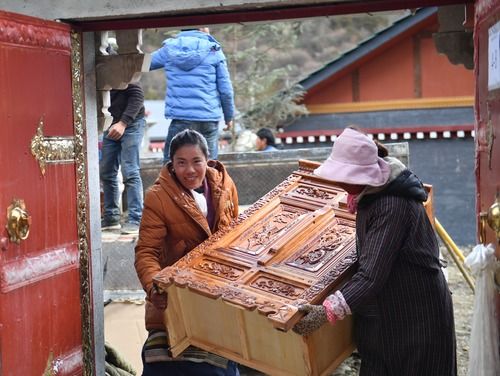 新搬入山南市隆子县玉麦乡的居民在往新家搬藏式柜子(2019年4月8日摄)。新华社记者 晋美多吉 摄