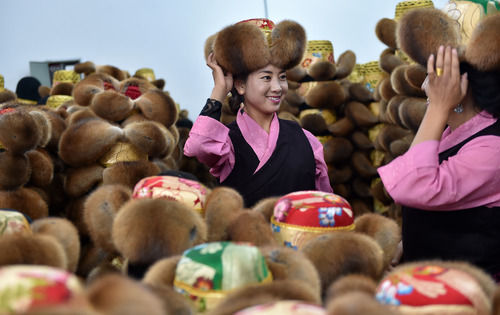 在扎囊县羊嘎藏帽加工厂,藏族姑娘在试戴传统藏帽(2018年10月9日摄)。 新华社记者 觉果 摄