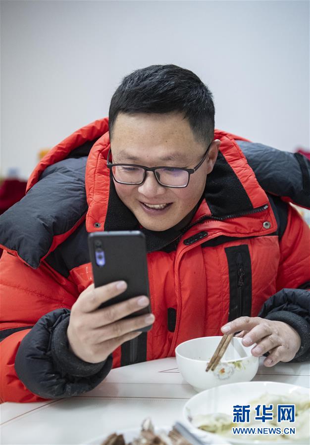 席振华一边吃着年夜饭,一边跟女儿视频(1月24日摄)。新华社记者孙非摄