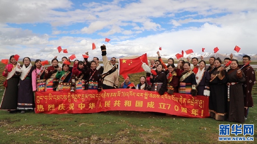 西藏网信办驻村工作队在海拔4900米的羌塘草原庆祝新中国成立70周年。
