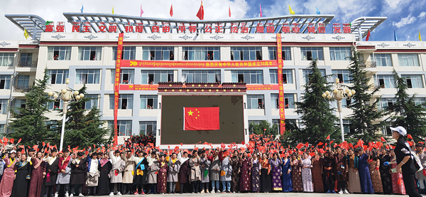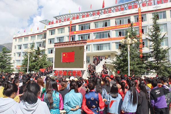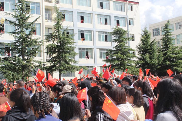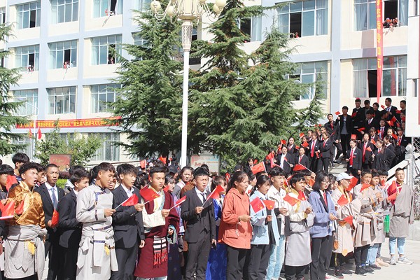 国庆节前夕,西藏职业技术学院内挂满了国旗,身着藏族服饰的拉姆老师缓步经过大屏幕,望着屏幕上高高飘扬的五星红旗,拉姆老师情不自禁地唱起了“五星红旗迎风飘扬,胜利歌声多么嘹亮……”激昂而富有感染力的歌声顿时吸引了广场上的人群,一曲经典的《歌唱祖国》将学校师生汇聚到了一起,鲜艳夺目的告白横幅从教学楼悬空而下,手拿小国旗的同学们从教学楼窗口探出头来,挥动着手中的国旗为广场的歌声增添色彩,高昂的歌声响彻校园,鲜红的国旗“红”遍校园。与此同时,校园绿茵场上新生军训方队不断变换出国旗、党徽、和“70”的图案,方队旁边国旗护卫队列出巨幅国旗,同学们用精神饱满的姿态、整齐划一的动作表达着他们对祖国的真挚祝福。