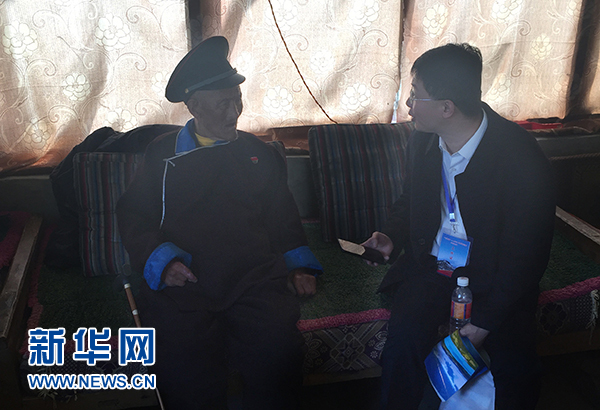记者采访扎西多布杰老人 柑丹鸯琦 摄